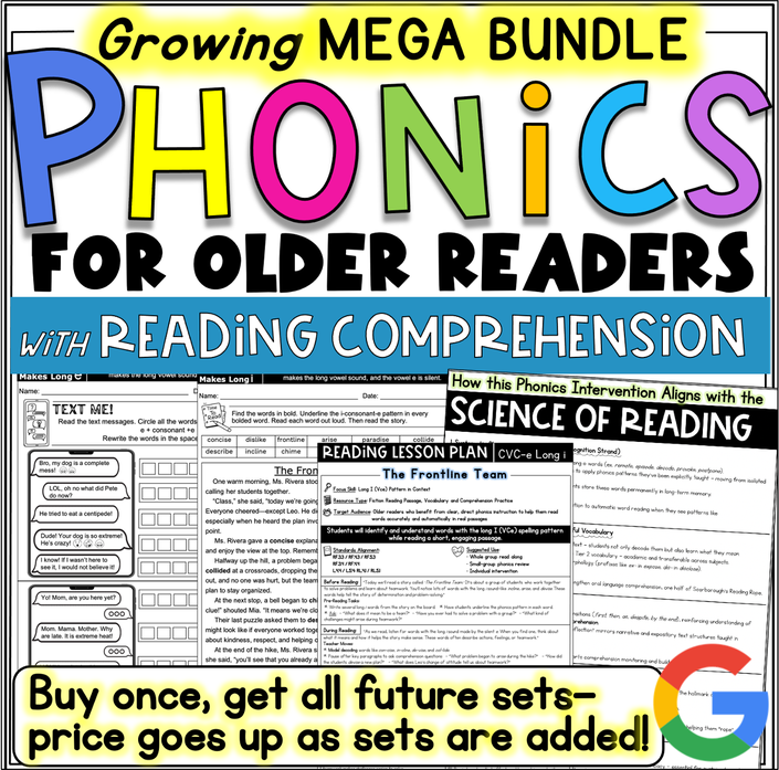 For older students who need phonics support. This phonics bundle includes everything you need to help your students master specific phonics skills, build vocabulary, apply the skills directly into their lives and practice with reading comprehension passages.